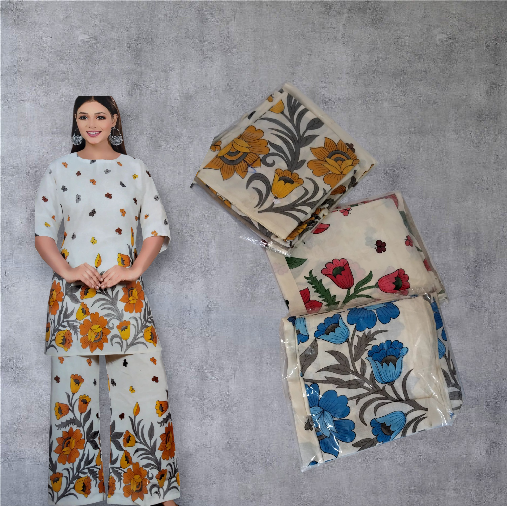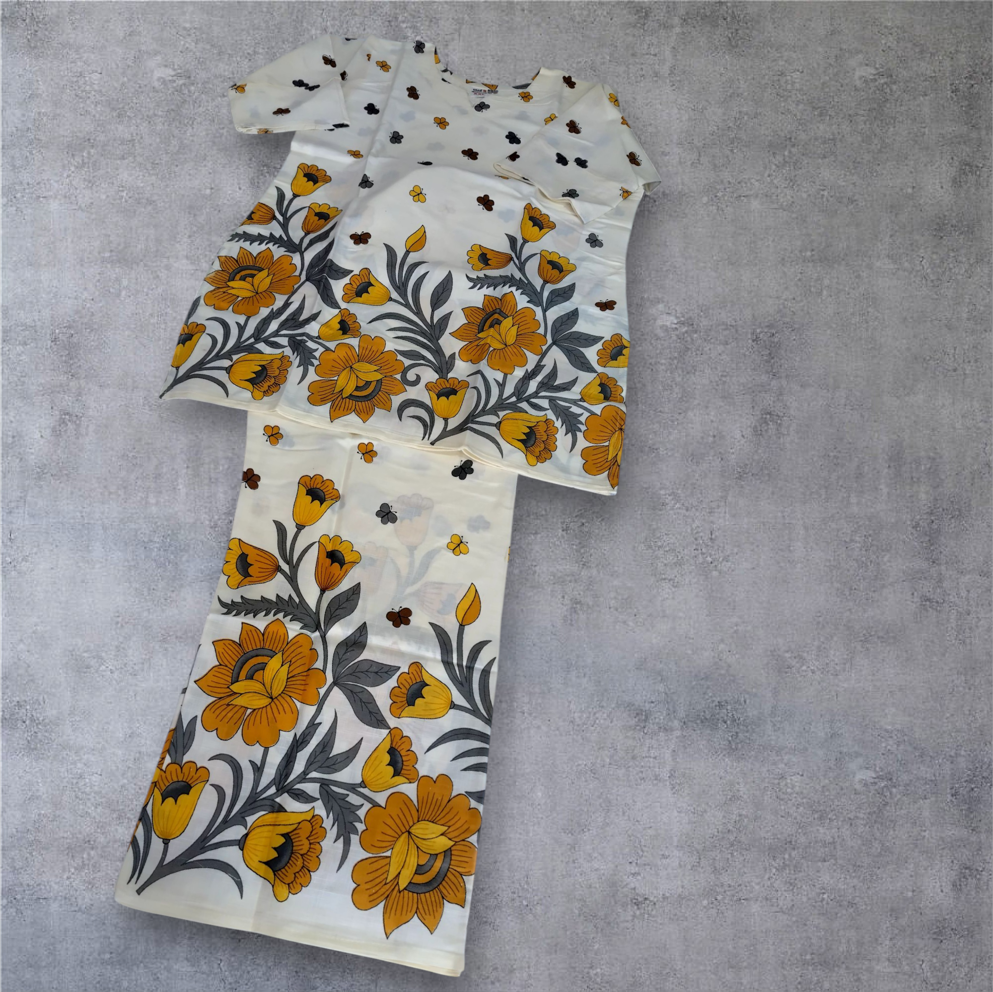 Color & Print: Matching off-white/cream base with big floral prints (same as the top’s lower part).