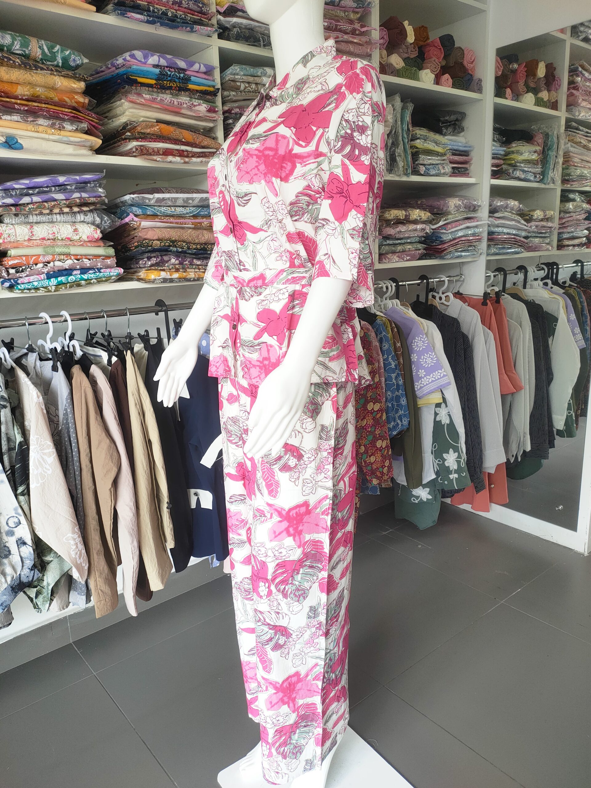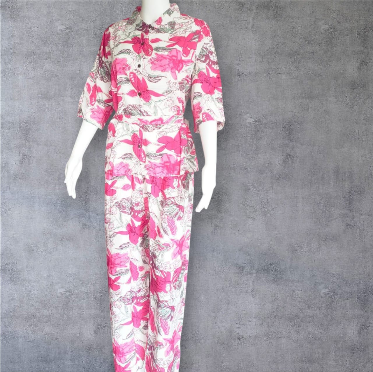 🎨 Color Theme: White base with bright pink floral and grey leafy prints.
