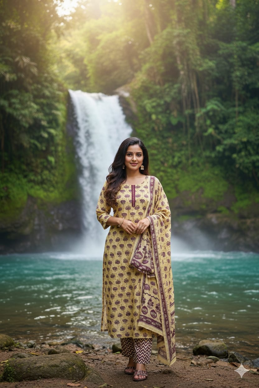 Three ps kurti set, cotton material, dark yellow back ground brown print design.