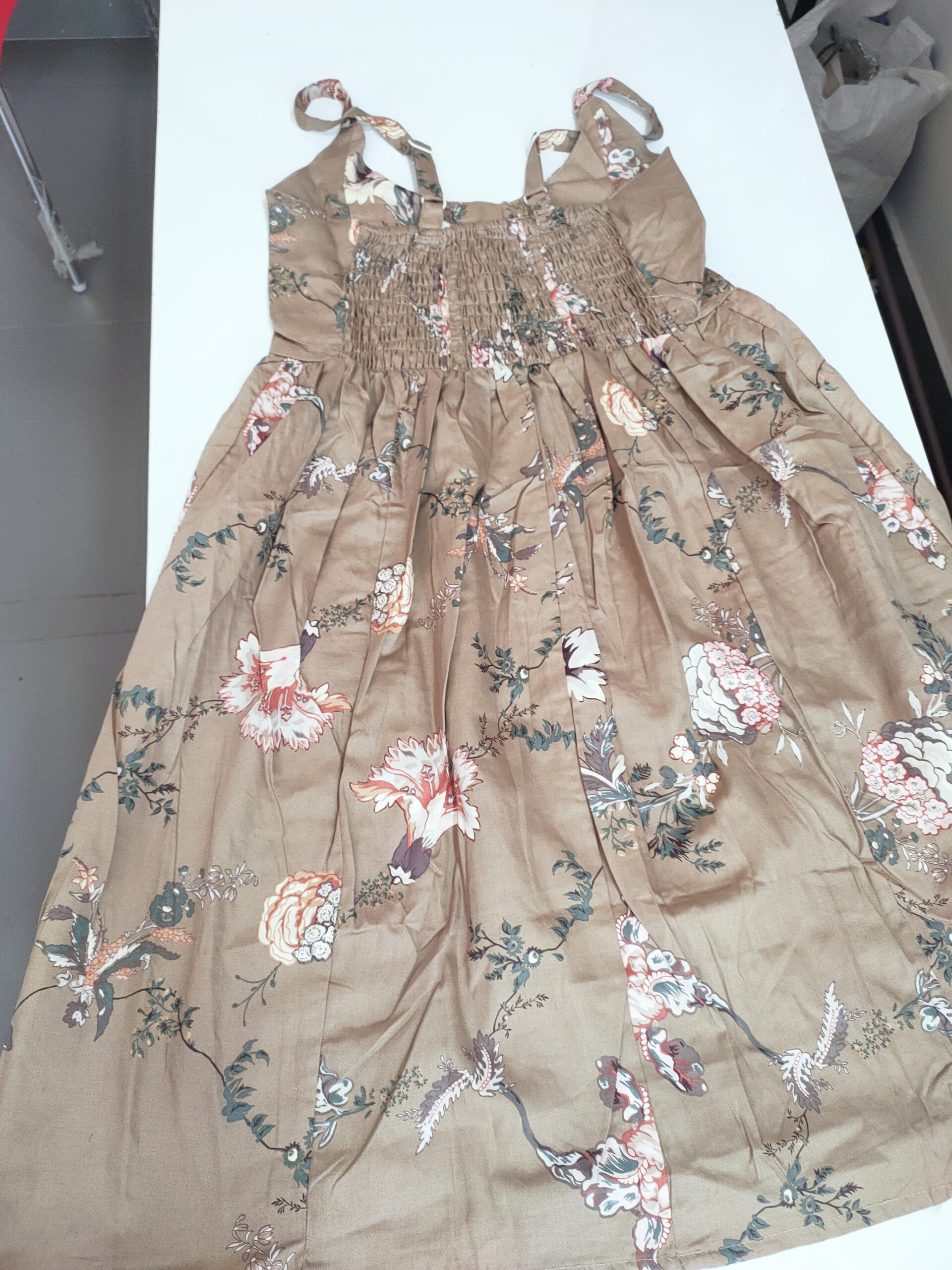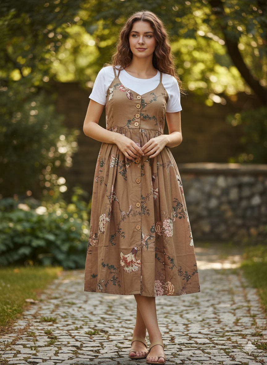 Color: Light brown/tan base with a floral print in shades of cream, pink, maroon, green, and white — giving it a vintage, earthy vibe.