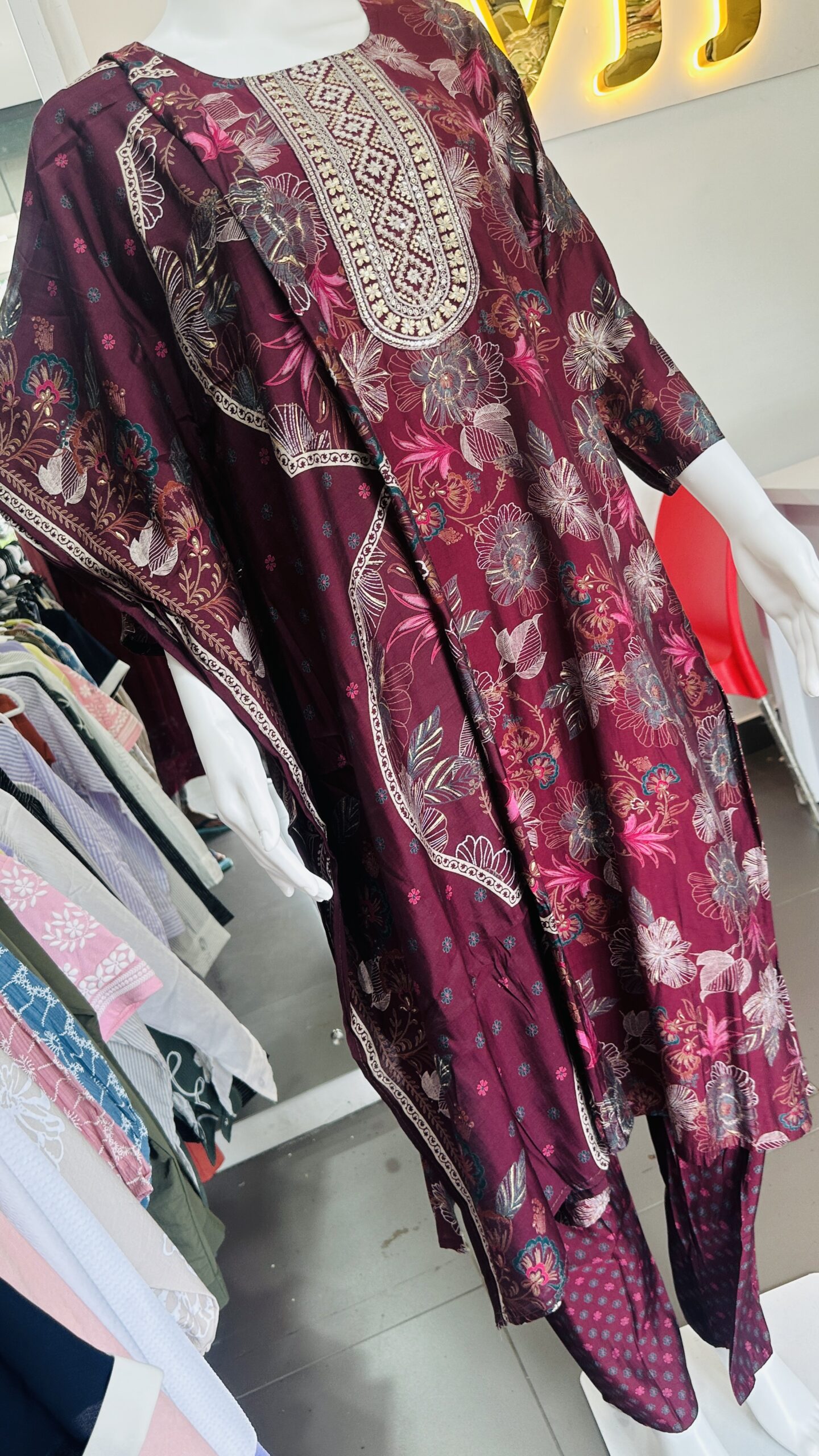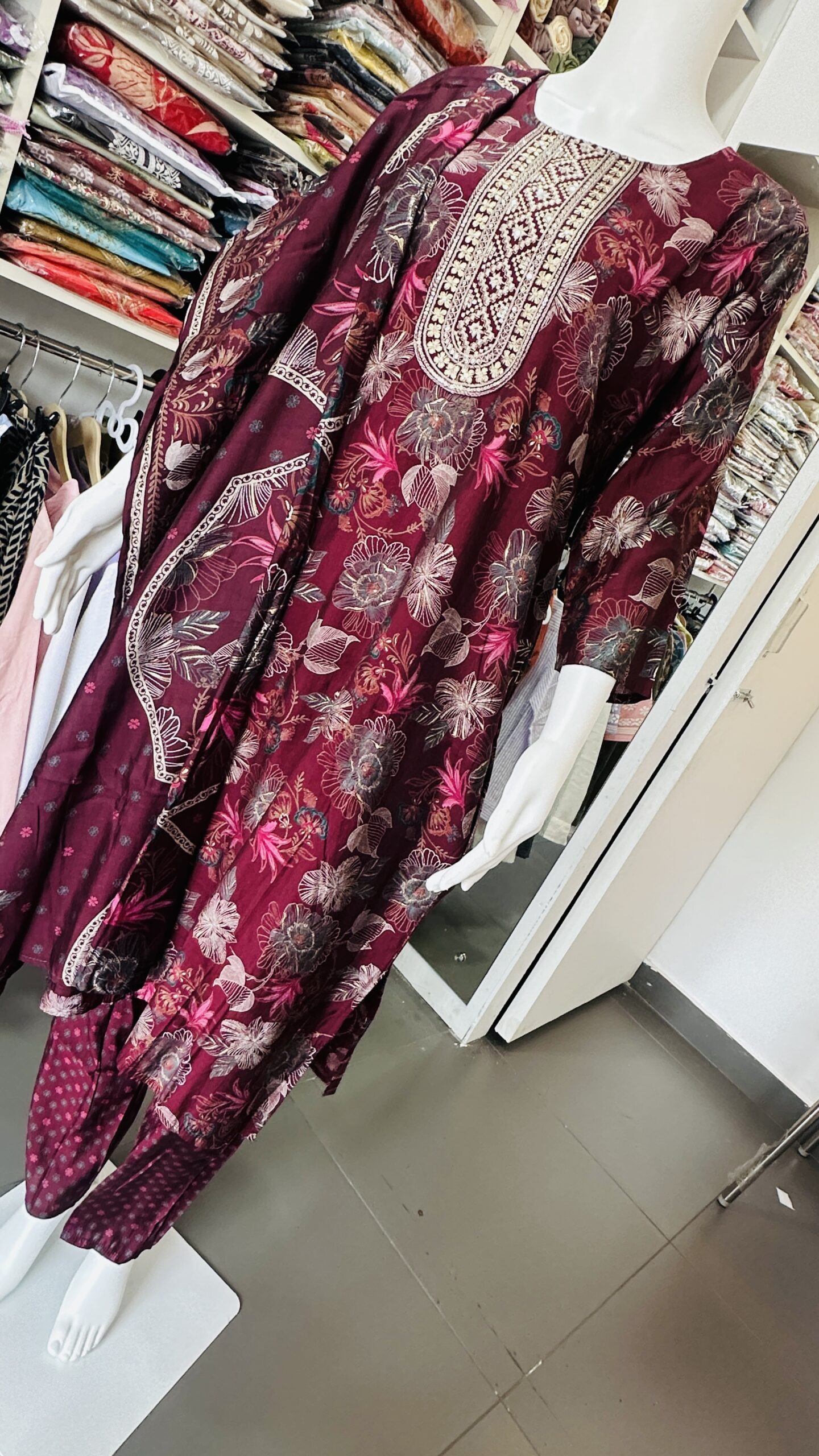 - The combination of bold floral prints, intricate embroidery on the neckline, and deep maroon shade makes it eye-catching and graceful.